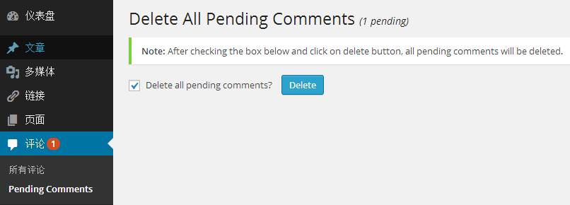 安装后在WP博客后台管理的评论(Comments)下面可以看到“Delete Pending Comments”(删除待审核评论)链接